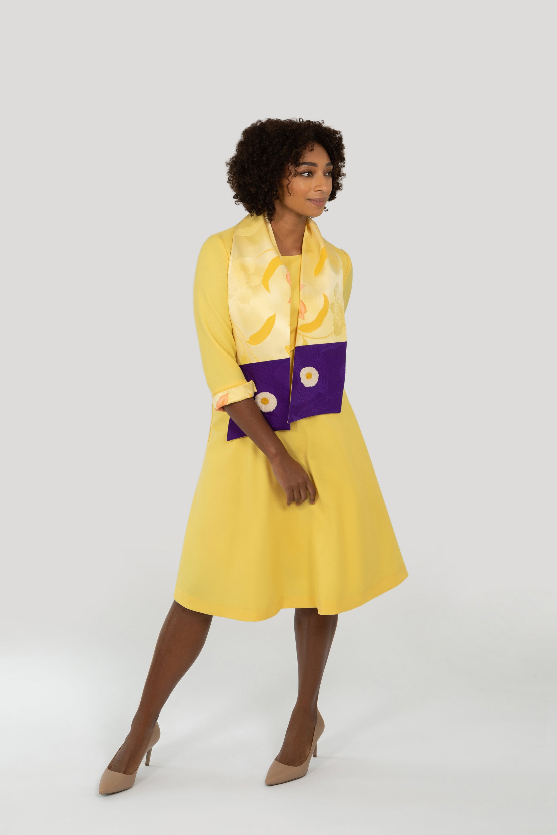 Each dress comes with a handmade and completely unique belt, which can double as a scarf. We have spent time collecting gorgeous vintage Japanese kimono silk, combining shapes and colours with each shade of wool crepe. On one side is wool crepe matching the dress colour, and on the other, two complimentary silks. We love the way it can change the whole look of an outfit. There are so many options and look forward to seeing how you style yours!