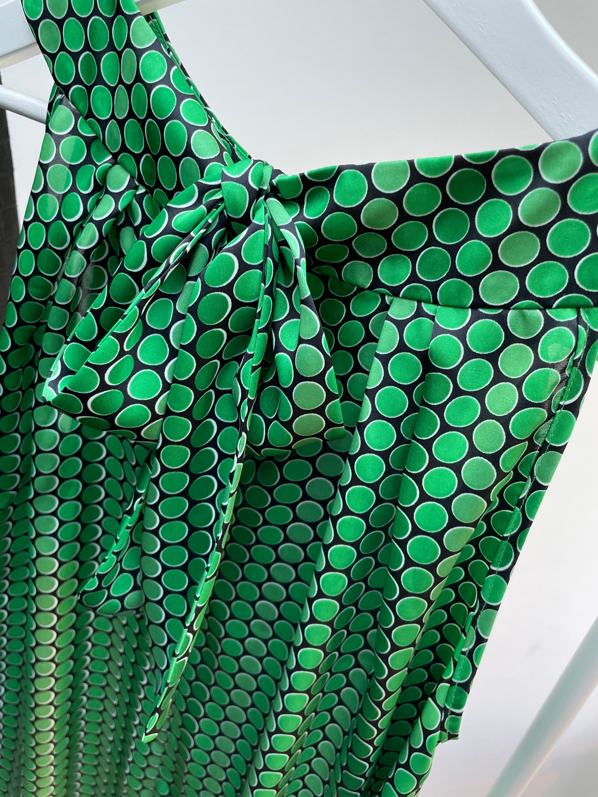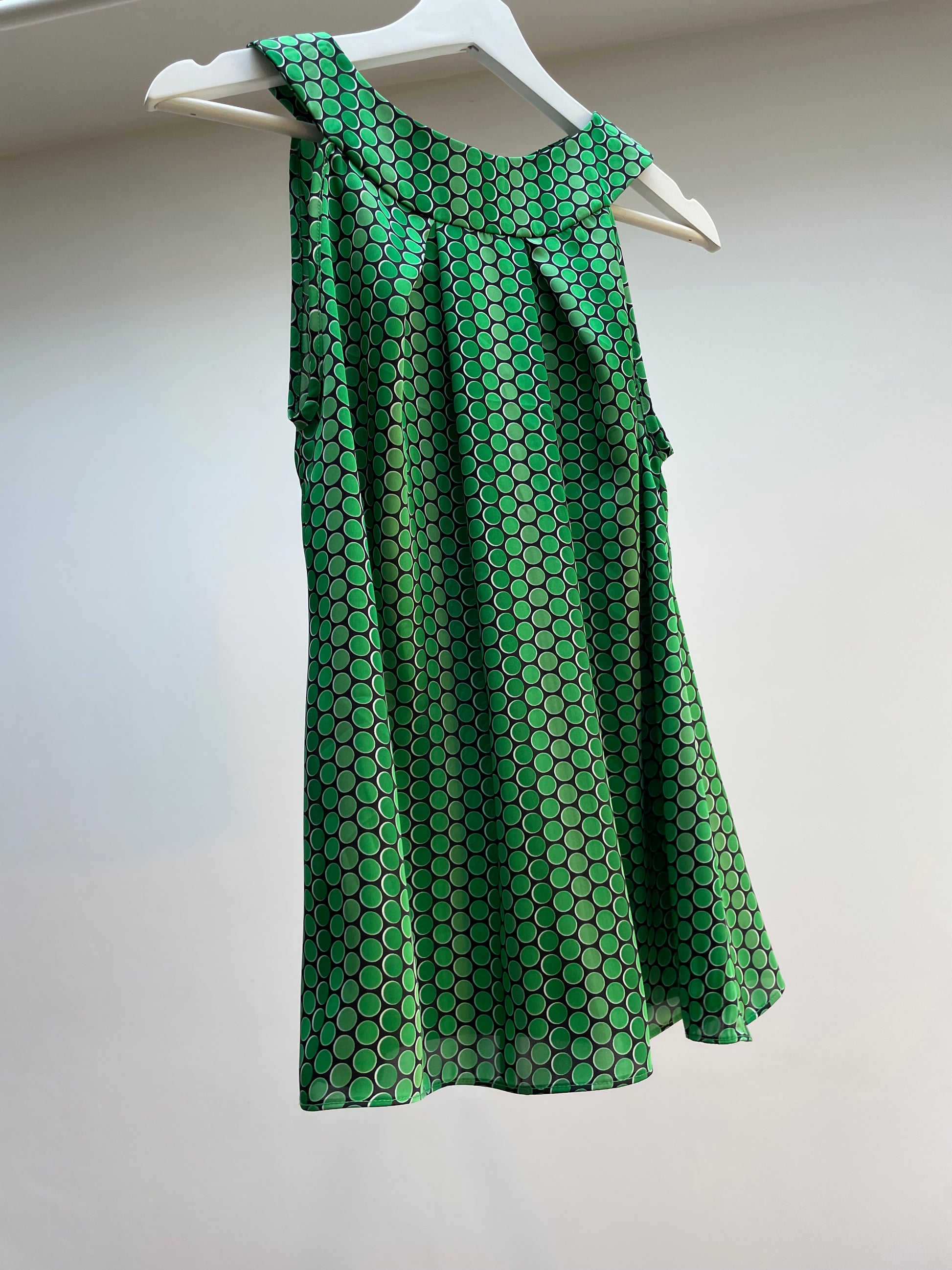 Pure silk satin in a wonderful bold green geometric circle print. We had just enough of this fabric to make a dress and this top. Once it’s gone it’s gone. However we are constantly finding fabulous fabrics - and for our next micro drop we have included some of our favourites. Do look through and let us know if you see something you like.