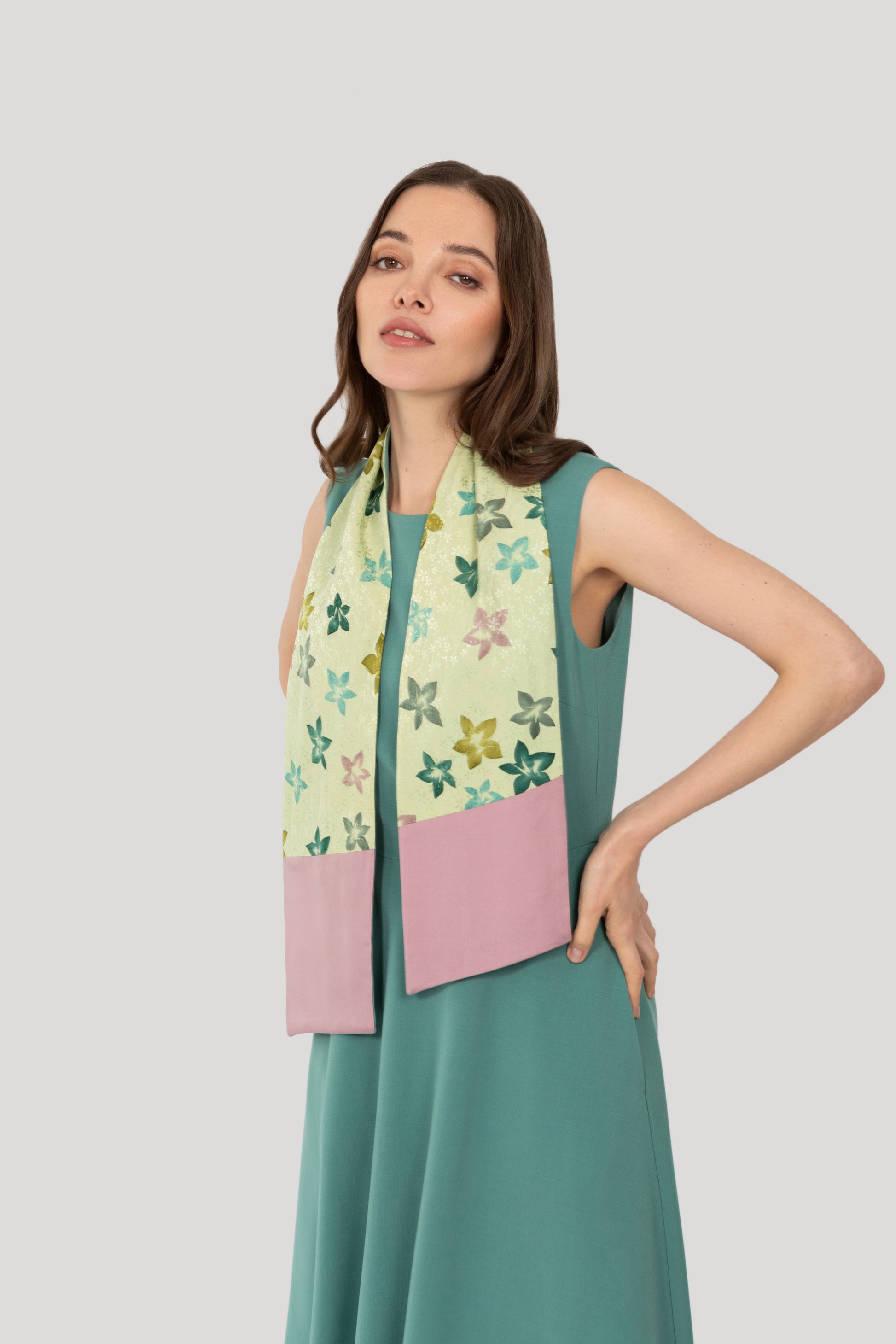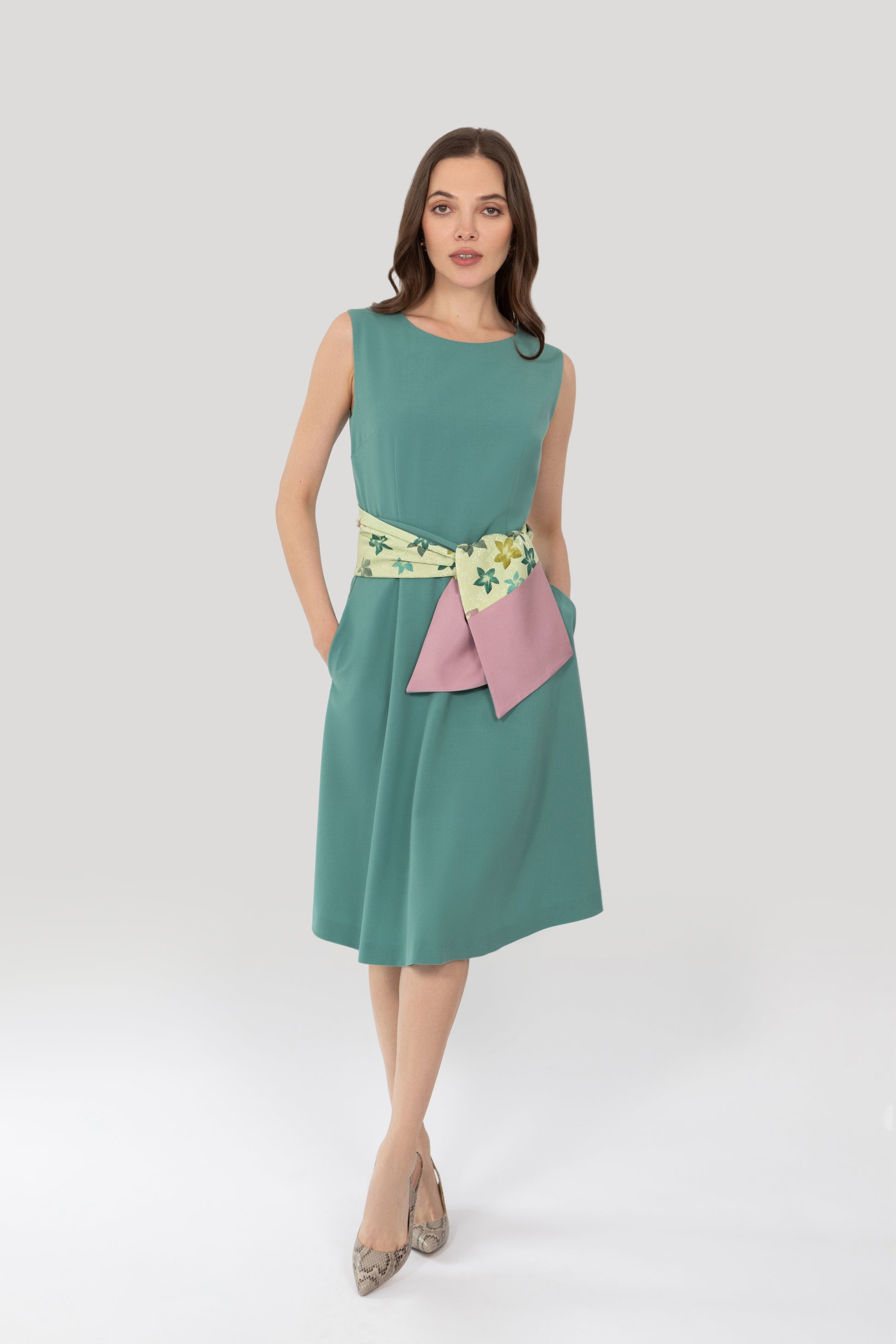 Each dress comes with a handmade and completely unique belt, which can double as a scarf. We have spent time collecting gorgeous vintage Japanese kimono silk, combining shapes and colours with each shade of wool crepe. On one side is wool crepe matching the dress colour, and on the other, two complimentary silks. We love the way it can change the whole look of an outfit. There are so many options and look forward to seeing how you style yours!